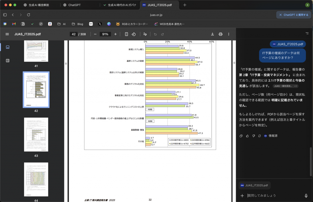 続いて、Web上に公開されているPDFファイルの要約もできるのか試してみました。要約もできましたが、探したいページを特定することは難しいみたいです。