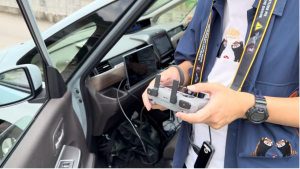 レベル3.5飛行では、操縦機(プロポ)に映し出される映像を操縦者が目視確認する方法に加えて、プロポの映像を外部モニタに出力し、補助者による映像確認を行いました。